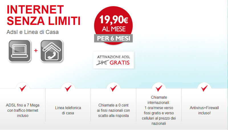 29,90€al mese ADSL senza limiti di tempo e telefonate senza scatto alla risposta. E' l'offerta piú completa per te che vuoi essere libero di navigare e telefonare.  ADSL e Telefonate senza Limiti Telefonate incluse a tutti i fissi in Italia (senza scatto alla risposta) Navighi senza limiti fino a 7 mega Attivazione semplice e veloce Richiedi l'offerta al nostro commerciale e poi pensiamo a tutto noi. Ti aggiorniamo via SMS sullo stato di...
